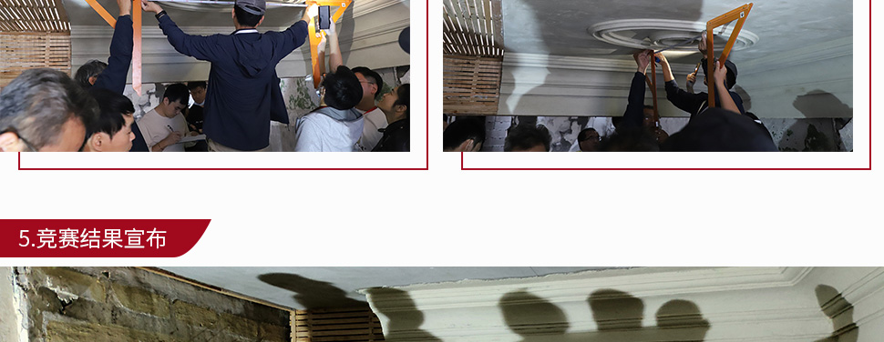 今年的競(jìng)賽項(xiàng)目是以傳統(tǒng)工藝制作天花線腳和燈圈。賽程分為三天,難度大,時(shí)間緊。由于我們抽簽為11號(hào),最后才輪到我們測(cè)量和繪圖,因此時(shí)間異常緊迫。測(cè)量完后自行準(zhǔn)備模具、導(dǎo)軌,第二天再到現(xiàn)場(chǎng)在4小時(shí)內(nèi)準(zhǔn)備線腳、燈圈糙坯制作。第三天需要在4小時(shí)扯制線腳、燈圈,可謂是分秒必爭(zhēng)。