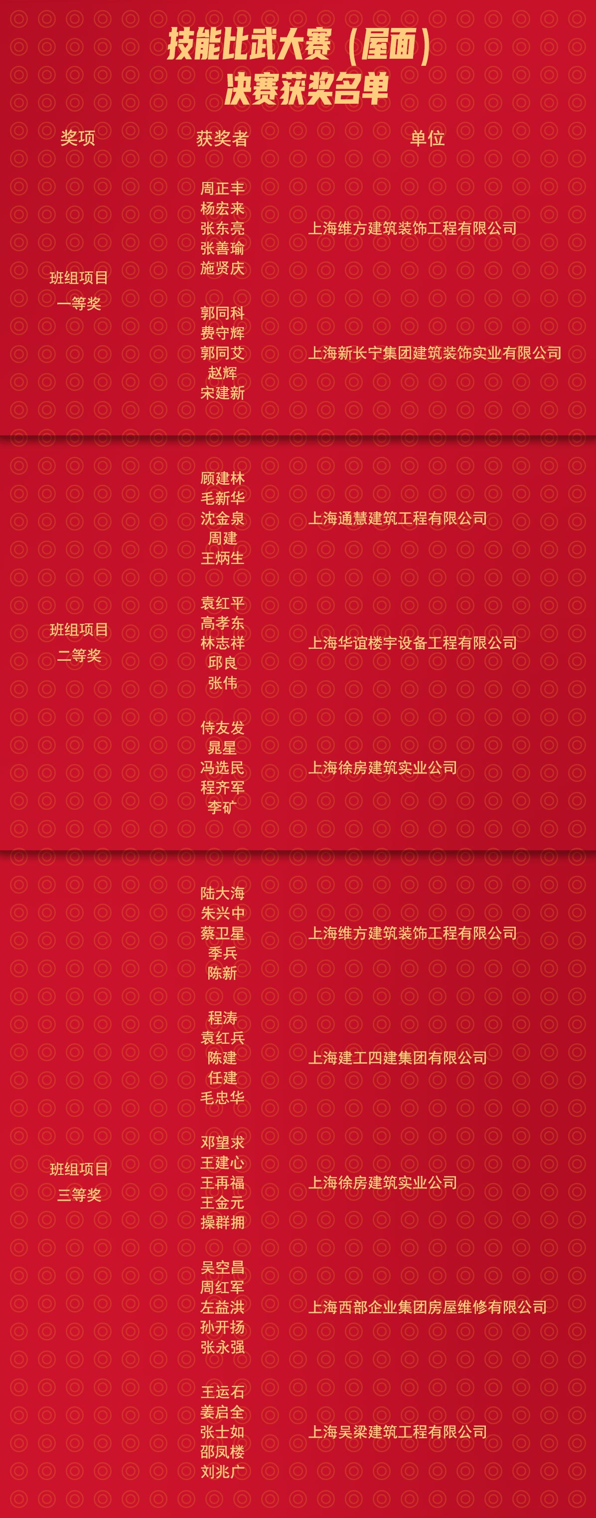 最終比賽獲獎(jiǎng)名單出爐,上海維方建筑裝飾工程有限公司斬獲“修繕技術(shù)能手” 銀獎(jiǎng)(個(gè)人)和班組項(xiàng)目一等獎(jiǎng)、三等獎(jiǎng)共計(jì)三個(gè)獎(jiǎng)項(xiàng)。
