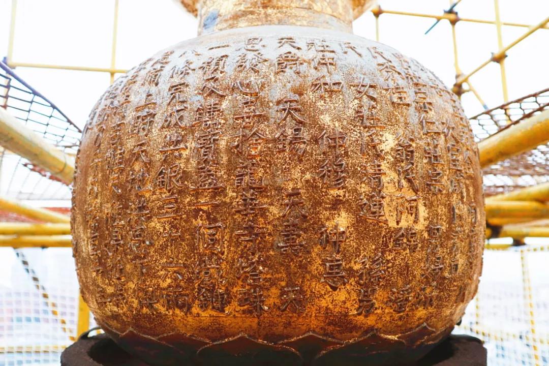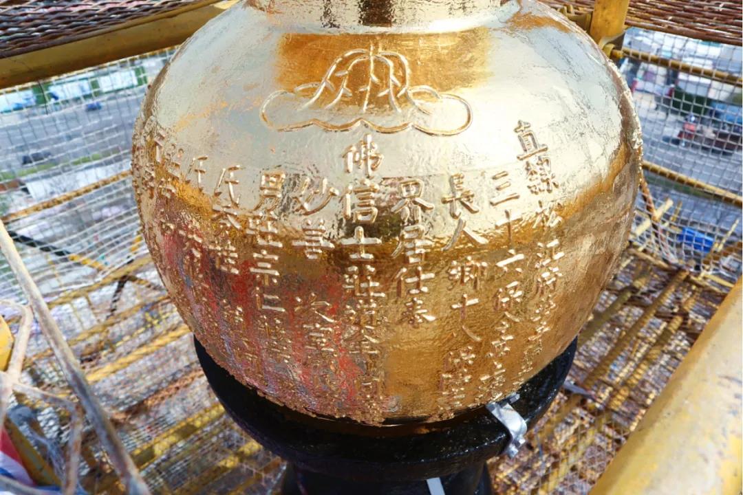 ? ? ? ? 龍華塔是上海地區(qū)保存最完好的宋代樓閣式塔,明人馮遷譽其為“千年飛塔”。舊時,“秋江塔影”與“龍華晚鐘”同樣蜚聲海內(nèi)外。龍華塔頂端塔剎葫蘆,上一次貼金箔修繕是在1984年,歷經(jīng)時間和風(fēng)雨的洗禮,斑駁銹蝕,金箔缺損嚴(yán)重。本次保養(yǎng)維護(hù)過程中,維修人員為塔剎葫蘆重貼金箔,再現(xiàn)璀璨金光。