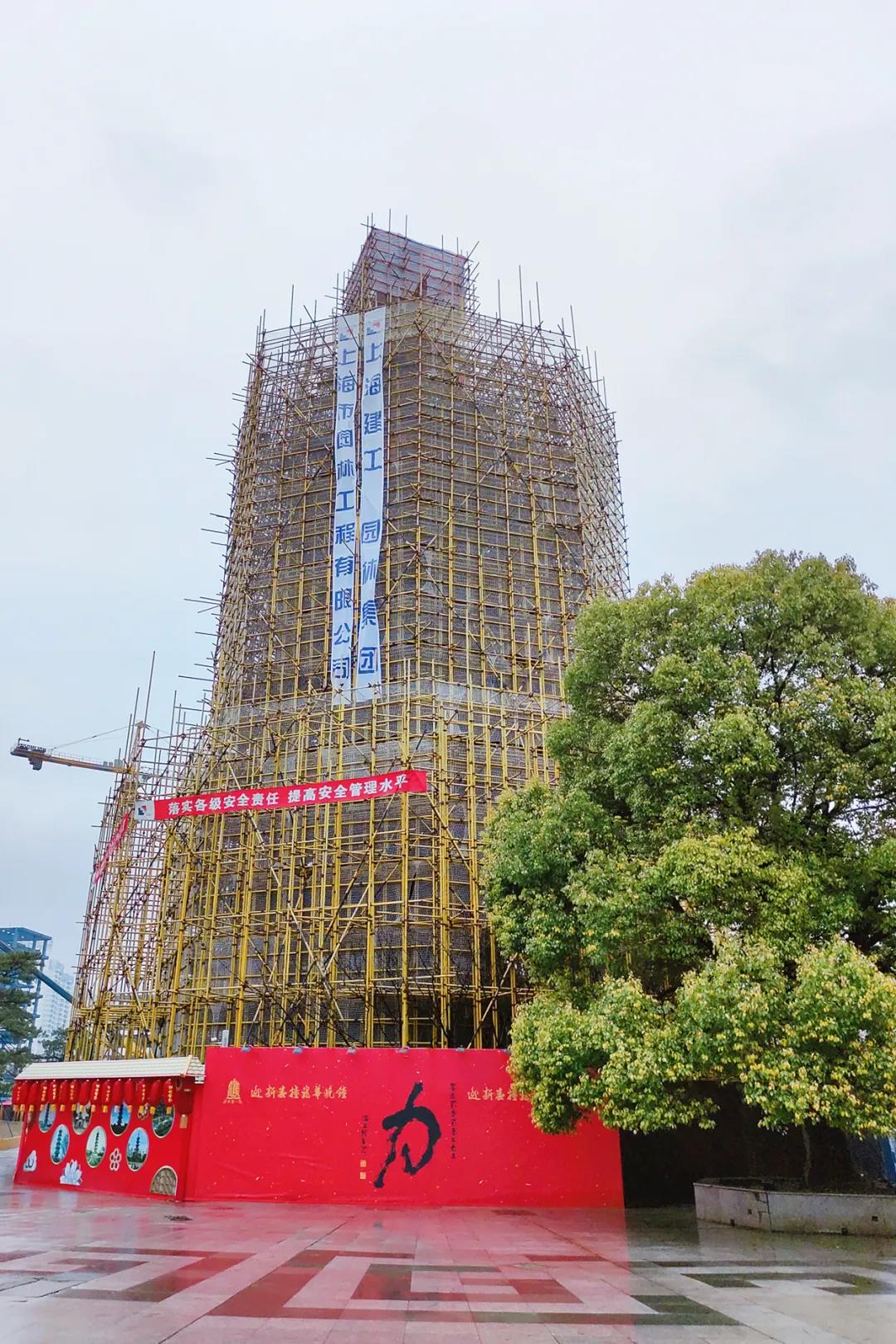 ? ? ? ??為了在龍華塔保養(yǎng)維護(hù)過程中,腳手架不與龍華塔有任何部位接觸,腳手架搭建方案經(jīng)過縝密設(shè)計與嚴(yán)格審查后,才得以實施。腳手架總重量達(dá)100多噸,從搭建方案設(shè)計到搭建完成,共耗時近4個月,占據(jù)了本次龍華塔保養(yǎng)維護(hù)項目總工期的近一半。