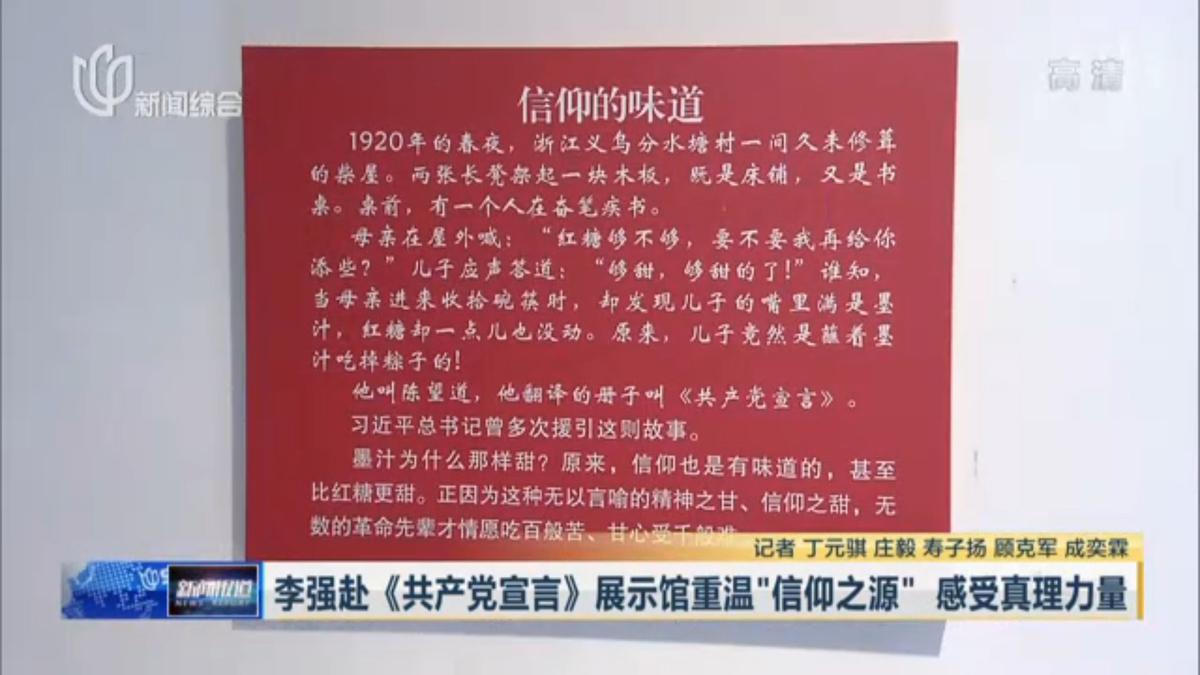 ? ? ? ? 1920年春,陳望道在浙江老家柴房苦譯《共產(chǎn)黨宣言》,曾將墨水誤作紅糖,吃下母親送來的粽子。“蘸著墨汁吃粽子,還說味道很甜”。這則被習近平總書記多次提及的故事“真理的味道”,在展廳中通過視頻播放。市領導在此駐足凝視,李強表示,在陳望道先生的舊居重溫“信仰之源”,確實深受觸動和啟迪,也感受到強大的真理力量,這對于我們不忘初心、牢記使命,把新時代中國特色社會主義推向前進,是一次深刻的教育。從歷史到現(xiàn)實,我們對馬克思和《共產(chǎn)黨宣言》的最好紀念,就是把習近平新時代中國特色社會主義思想這一當代中國馬克思主義研究好、宣傳好、貫徹好。